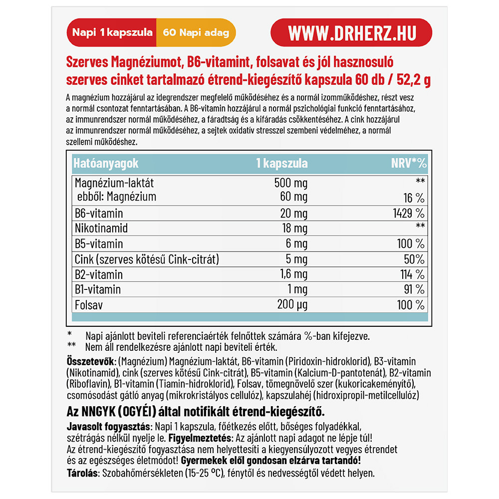 Összetevők: Magnézium (magnézium-citrát, magnézium-biszglicinát, magnézium malát), tömegnövelő szer (rizskeményítő), csomósodást gátló anyag (mikrokristályos cellulóz), kapszulahéj (hidroxipropil-metilcellulóz)