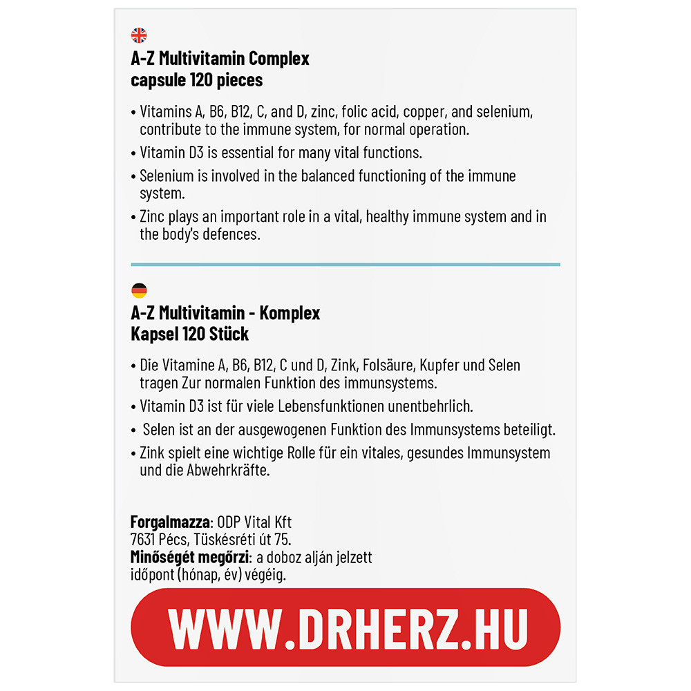 Összetevők: L-aszkorbinsav, magnézium-oxid, kalcium-oxid, kálium-klorid, nikotinamid, D-alfa-tokoferol, cink-citrát, kalcium-D-pantotenát, vas-fumarát, piridoxin-hidroklorid, riboflavin, tiamin-hidroklorid, réz-glükonát, béta-karotin (A-vitamin), folsav, (pteroilmonoglutaminsav, kalcium-L-metil-folát) biotin, kálium-jodát, menakinon,kró,-pikolinát, nátrium-molibdát, szelénnel dósított élesztő, kolekalciferol, cianokobalamin, tömegnövelő szer (kukoricakeményítő), csomósodást gátló anyag ( mikrokristályos cellulóz), kapszulahéj hidroxipropil-metil-cellulóz
