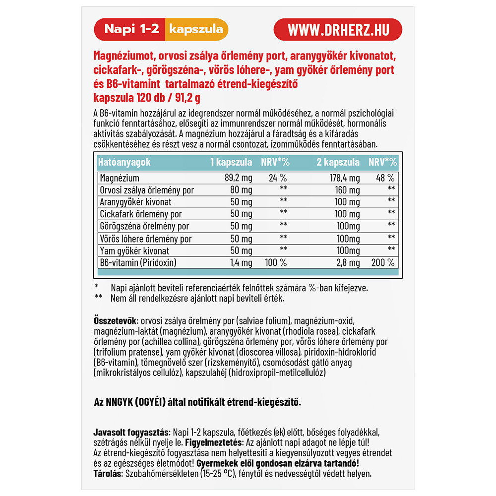 Magnéziumot, orvosi zsálya őrlemény port, aranygyökér kivonatot, cickafark-, görögszéna-, vörös lóhere-, yam gyökér őrlemény port és B6-vitamint tartalmazó étrend-kiegészítő kapszula 120 db / 91,2 g