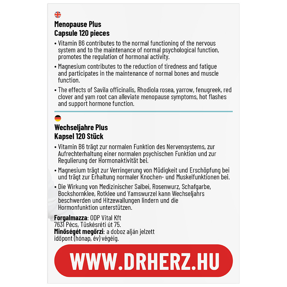 Összetétel: orvosi zsálya őrelmény por (salviae folium), magnézium-oxid, magnézium-laktát (magnézium), aranygyökér kivonat (rhodiola rosea), cickafark őrlemény por (achillea collina), görögszéna őrlemény por, vörös lóhere őrlemény por (trifolium pratense), yam gyökér kivonat (dioscorea villosa), piridoxin-hidroklorid (B6-vitamin) ,tömegnövelő szer (rizskeményítő), csomósodást gátló anyag (mikrokristályos cellulóz), kapszulahéj (zselatin)